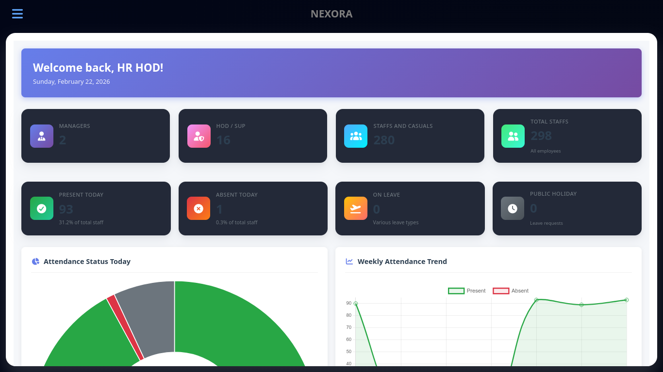 Nexora is an all-in-one HR Core platform designed for companies that need to manage staff, work permits, payroll, rostering, attendance, and role-based access — all in one place.